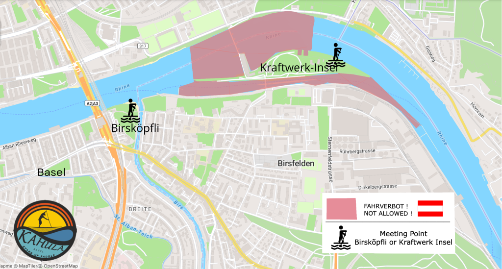 Bei der Buchung geben Sie uns einfach Bescheid, wo Sie paddeln möchten: entweder auf der Kraftwerk-Insel oder Birsköpfli an der Basler Seite. An beiden Orten bieten wir unsere Kurse, Touren und Verleihmöglichkeiten an.